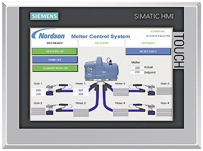 Sie eröffnen dem jeweiligen Kunden die Möglichkeit, auf der HMI der Anlage ein individuelles und intuitives Bedienfeld für jedes Gerät inklusive Melter zu erstellen. Darüber hinaus werden die Steuerungs- und Kontrollfunktionen des Verklebungsvorgangs erheblich erweitert, da nahezu alle Daten des Schmelzgeräts eingestellt und ausgewertet werden können.