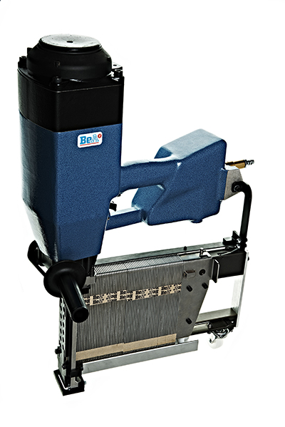 Die 346-Breitrücken-Heftklammer kann im mobilen Einsatz von dem Handgerät 346/200-951E verarbeitet werden. Wie bei allen Geräten der BeA ist auf Ergonomie und Handling des Gerätes besonderer Wert gelegt worden. Ein zweiter Handgriff sorgt für eine bessere Gewichtsverteilung und den optimalen Bedienungskomfort. Ein materialschonender Werkzeugschuh und eine Gleitrolle stellen die exakte Balance des Gerätes sicher und erleichtern die Arbeit. Das Gerät verfügt ebenso über eine Leerschuss-Sperre für werkstückschonendes Arbeiten, wie eine Einzelauslösung mit Sicherungsfolge, die das ungewollte Auslösen verhindert.