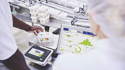 Blue HMI im Einsatz mit einem Wägeindikator beim statischen Verwiegen: Einheitliche Workflows erleichtern die Bedienung und steigern die Effizienz in der Produktion.