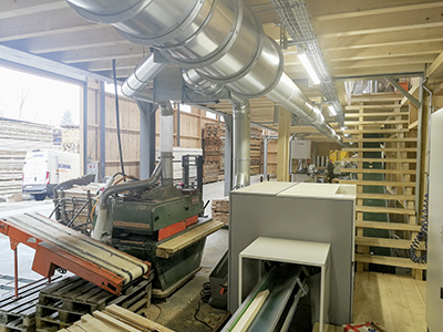 Das neue Filtersystem sollte das Staub- und Späneaufkommen (bis zu 30 m3/Tag) von sieben Sägen und Hobeln absaugen, dem Silo zuführen und eine günstige Energiebilanz haben.