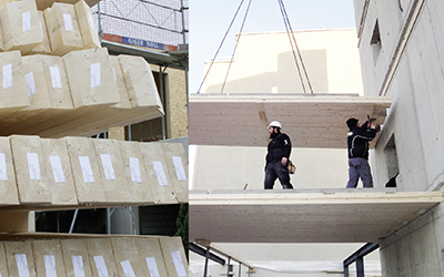 Nach Plan gefertigte Brettstapel Geschossdecken, Wände und Dachaufbauten sowie abgebundene RBK, BSH-, DUO-Balken können kostensparend zum direkten Einbau auf die Baustelle geliefert werden.