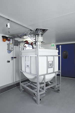 Die pulverförmigen Grossmengen kommen entweder direkt vom Sprühturm oder werden in Silofahrzeugen angeliefert und pneumatisch in Aussensilos umgefüllt. Entsprechende Füllstandmesssysteme überwachen diesen Vorgang und Entlüftungsfilter sorgen für eine störungsfreie Beschickung der Silos. Die Austragung erfolgt über universell einsetzbare Vibrationsböden, bestimmte Milchpulversorten können auch über Belüftungsböden ausgetragen werden. Die ebenerdig angelieferten Big-Bags werden mit Staplern zu den Big-Bag Entleerstationen gebracht, dort mit Hilfe von Hebezeugen eingesetzt und über spezielle Andocksysteme staubdicht angedockt. Die exakte Einschleusung in die Förderleitung erfolgt über Dosierschnecken mit Grob-/Feinumschaltung. Dadurch können hohe Genauigkeiten erreicht werden. Sackware wird ebenerdig über Einfülltrichterstationen in das geschlossene System aufgegeben. Die Einfülltrichterstationen verfügen über eine Absaugung, die ein staubarmes Einfüllen ermöglicht. Um zu verhindern, dass grobe Verunreinigungen in die pneumatischen Fördersysteme gelangen, sind die Einfülltrichter mit entsprechenden Vorsieben ausgestattet. Auch hier wird mit Dosierorganen in die Förderleitung eindosiert, dies können Dosierschnecken, aber auch Zellenradschleusen sein. Um sicherzustellen, dass keinerlei Verunreinigungen in die Produktion gelangen, werden die Rohstoffe nochmals über eine Wirbelstrom-Siebmaschine im Förderstrom zur Förderwaage gefördert. Sie verhindert in Kombination mit einem Metallabscheider, dass Verunreinigungen oder metallische Gegenstände in die Förderwaage gelangen. Das Saugwiegesystem besteht aus Förderwaage und Unterdruckerzeuger. Die Rohstoffe werden in die Förderwaage gesaugt und gleichzeitig exakt gewogen. Ist die Charge komplett, wird sie über Auslaufklappen in den nachfolgenden Mischprozess entleert.